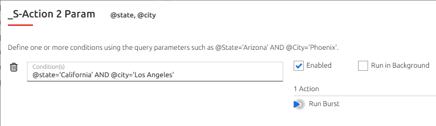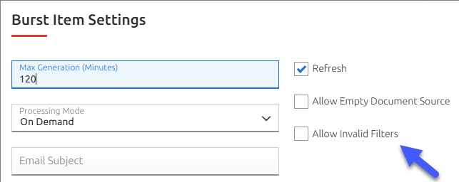 Allow Invalid Filters option added for Web Intelligence. By default, a Burst that uses filtering will abort of a filter value is supplied that is not in the list of values from report data. This option allows an invalid value to be passed without abort.