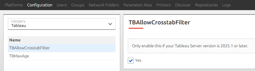 Support added for Tableau Workbook filtering and export to Excel Crosstab format. Filtering to Excel Crosstab format not supported by Tableau in Tableau versions prior to 2025.1. Tableau version must be 2025.1 or later and TBAllowCrosstabFilter must be enabled under System > Configuration > Category:Tableau.